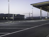 a parking lot with an empty walkway between two building at twilight time with a clock