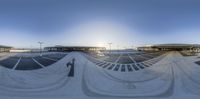 A cityscape at dawn with a skating park and parking lot in the foreground. Sunlight casts tints and shades on the asphalt road surface. The urban design features architectural facades and a stadium in the distance.