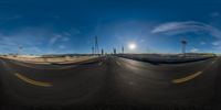 A classic urban landscape at dawn, with a long straight road leading to a bustling city. Skyscrapers and architectural landmarks line the skyline. Vehicles blur in motion along the road, while overhead power lines cast long shadows. A vibrant city awakening to a new day.