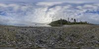 A serene coastal landscape at dawn. The grey sky reflects off the calm water, contrasting with the rocky bedrock and gravel shoreline. A peaceful and gloomy start to the day.