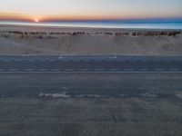 An elevated view of a coastal road in Holland during dawn. The road stretches along the shore with clear skies and sunlight reflecting on the water. The open landscape and fence add to the serene atmosphere.