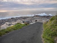 A coastal landscape at dawn, with a road winding through the highland terrain. Clouds hover above the ocean, while grass and dirt cover the road surface. A boat ramp provides recreational access to the water.