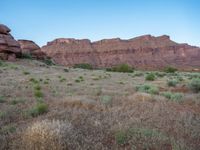 Dawn breaks over the Fisher Towers in Utah, USA. The open landscape showcases the beauty of the canyon, with dirt and gravel surfaces contrasting against the greenery and sand. A peaceful and serene nature scene.