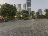 A city skyline at dawn in Guangzhou, China. The modern architecture of skyscrapers dominates the cityscape, with an open space courtyard in the foreground. The clear sky reflects the artificial lights of office buildings, capturing the vibrant city life.
