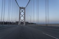 A straight and long road at dawn with a clear sky and a break of day. The white architecture of a suspension bridge and a cable-stayed bridge can be seen in the distance. The road surface is smooth and the motion blur suggests movement. Infrastructure and highway lines guide the way.