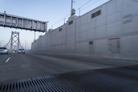 A stunning view of a highway during dawn. The road, lined with composite material, stretches out before disappearing into the horizon. Motion blur adds to the sense of speed. Clear sky overhead.