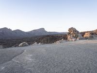 A person walks up the hill at dawn in Tenerife, Spain. In the background, a mountain range with large rocks and a rugged landscape. The clear sky and open space create a sense of wilderness and adventure.