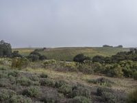 This is a photograph taken during dawn in California, USA. The image showcases a foggy and gloomy landscape with a grey sky. The vast plain is covered in vegetation and features fields, farms, and vineyards. The rugged terrain is characterized by gravel and soil, while shrubs can be seen scattered throughout. The photo captures the rural and agricultural nature of the area, with land lots and plantations stretching far into the distance. In the foreground, there is a grassy surface, adding texture to the scene. This is a perfect representation of the beauty and charm of California's natural landscapes.