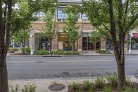 This is an image of a cityscape at dawn in Denver, Colorado, USA. The photo captures the architectural diversity of the city, showcasing low-rise apartment buildings, homes, and office buildings. In the foreground, there is a road with asphalt and a crosswalk. The surrounding area is a residential neighborhood with trees and grass. This image represents the urban atmosphere and real estate opportunities in Denver. The clear sky and the presence of shops and storefronts illustrate the thriving business district. A perfect depiction of the urban charm of Denver, Colorado.