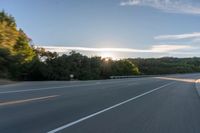 This is an image of a road at dawn, with the sun visible on the horizon. The asphalt road surface leads through a beautiful landscape of hills and vegetation. The sunlight casts a warm glow, illuminating the trees and creating vibrant shadows. A guard rail and Armco barrier provide safety along the road. The clear sky and sunny weather add to the overall serene and peaceful atmosphere of the scene. This photo captures the beauty of nature and the tranquility of a break of day.