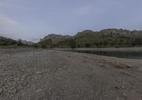 the mountains in the distance are filled with trees and rocks and a river bank is empty