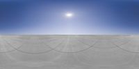 A serene landscape at dawn, with the sun visible through a clear sky. The concrete surface of an open space reflects the sunshine, creating a beautiful HDR light effect. Nature's beauty captured in Europe and Asia.
