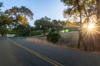 sun rays shining through trees on the side of a street in california, usa with green leaves on the roadside