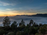 a person is sitting on a bench looking at the sunrise above the fog filled mountains
