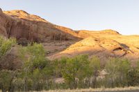 A breathtaking dawn view of the desert landscape in Utah, USA. The red rock mountains and canyons of Canyonlands National Park contrast with the open grassy plains. A perfect off-road track awaits in North Wash, surrounded by the stunning natural environment.