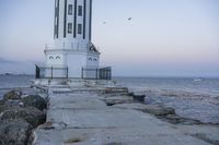 A serene coastal view of Los Angeles at dawn. The low-lying architecture contrasts with the calm ocean waters and clear sky. The iconic pier and lighthouse add to the picturesque harbor scenery.