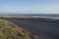 an empty road near a beach and waves as well as cars on the sand and houses on the beach
