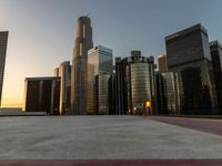A breathtaking view of Los Angeles at dawn, showcasing its futuristic architecture in the business district. The cityscape contrasts with the open spaces and concrete surfaces. Helipads and office buildings dot the urban landscape.