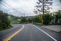 This image showcases a narrow road in a suburban area of Los Angeles, USA. The road is surrounded by trees and lined with yellow traffic signs. The cloudy, gloomy sky creates a sense of ambiance, distinguishing it as a dawn or early morning scene. The photo depicts a typical residential neighborhood, capturing the essence of a quiet, suburban setting. The grey sky adds a touch of melancholy to the overall atmosphere. This photo represents a tranquil morning in a Los Angeles suburb.