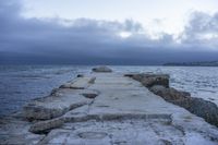 A beautiful dawn at a rocky pier in Los Angeles, California, USA. The pier stretches out into the ocean, with benches at the end offering a serene view of the water surface. The rocky shore and gravel pathway lead straight down the road to the jetty, creating a picturesque scene. The clouds on the horizon add a touch of drama to the sky, while the waves break gently against the rocks. This coastal landscape captures the tranquility and natural beauty of the California coast at the break of day.
