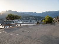 A panoramic view of a coastal road in Mallorca, Spain at dawn. The sun is visible, casting a warm glow on the asphalt and Armco barrier. The open space overlooks the sparkling ocean, creating a sunny and serene landscape in the Balearic Islands.