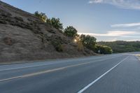 A scenic rural landscape at dawn, with a mountainous backdrop. The asphalt road winds through the slopes, surrounded by lush vegetation. Clouds dot the sky, adding contrast to the hillside scenery.