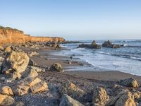 This image captures the beauty of the California coast at dawn. The open space and natural environment offer stunning views of the coastal landscape. With clear skies above, the waves crash against the sandy beach, while the cliffs and headlands provide a picturesque backdrop. The calm ocean and lake in the distance further enhance the serene atmosphere. This photo showcases the endless beauty of nature along the California shoreline.