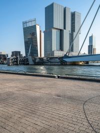 This image captures the essence of urban life in the Netherlands. The clear sky provides a stunning backdrop to the modern architecture and high-rise buildings that line the cityscape. The cobblestone sidewalk runs alongside the tranquil lake, creating an open space for people to enjoy. As the sun rises, the dawn illuminates the urban design of the city, showcasing its sophisticated and vibrant atmosphere. This photo represents the harmonious blend of Europe's contemporary style and Holland's unique charm.