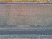 This is an aerial view of a coastal landscape in Holland, Netherlands. The image captures the break of day, with the dawn light reflecting off the ocean. The open space consists of grass, vegetation, and trees, creating a natural and serene atmosphere. The pattern of the asphalt road cuts through the landscape, leading to a high bridge with a composite material flooring. The top-down perspective showcases the rectangular shape and grey hue of the road surface. This photo represents the elevated beauty of Holland's coastal nature and infrastructure.