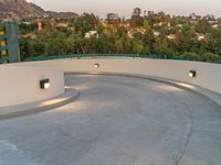 a very large circular concrete area by the trees and hill tops in the background of the city