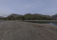 This is an image of a breathtaking landscape in Mallorca, Spain. The photo captures the break of day, with the clear sky reflecting on the calm surface of the sea. The coastal area features rocky headlands and a sandy shore, creating a picturesque view. In the distance, a mountain rises high, overlooking the open space. The Balearic Islands are known for their beautiful nature and water resources, as depicted in this stunning photo. With its combination of highlands, hills, and coastal beauty, this image showcases the diverse landscapes of Mallorca in Europe.