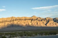 A scenic view of a road cutting through the California desert at dawn. Majestic mountains and grassy plains dominate the landscape. The clear sky is dotted with clouds and contrails, adding to the natural beauty. A perfect day to explore the rugged terrain.