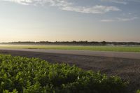 This is an image of a rural landscape in Canada at dawn. The low horizon is visible as the sun begins to rise, casting a warm glow over the plain. The asphalt road stretches into the distance, leading through fields and lush farmland. The sky is filled with clouds and contrails, creating a beautiful natural environment. This photo showcases the peaceful serenity of the rural countryside in Canada, specifically in the area of Kettle Creek.