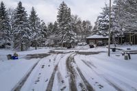 A residential area in Toronto, Ontario at dawn. The straight road leads up a slope, lined with houses and trees covered in snow. The gloomy grey sky adds to the somber atmosphere.