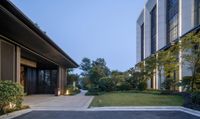 A modern residential villa in Foshan, Guangdong, China. The courtyard is adorned with trees and bushes, and a paved walkway. Clear skies and artificial light create a surreal ambiance in this urban oasis.