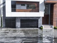 This image captures the beauty of modern architecture in Los Angeles, California, USA. The photo showcases a residential area with a mix of houses, apartments, and villas. The buildings have sleek facades and are made of concrete and other modern materials. The wet surface of the road and the paver add a reflective effect to the scene. In the foreground, a parking garage can be seen, while in the background, the sun is rising, casting a warm glow on the clouds. This photo represents the real estate and architectural charm of Los Angeles.