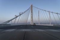 A stunning dawn view of a straight road stretching into the horizon. The asphalt road surface creates a motion blur effect, adding to the sense of movement. The clear sky complements the infrastructure of the bridge, highlighting its architectural beauty.