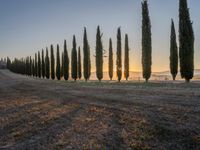 the sun is rising behind a row of cypress trees in the countryside of tuscany, italy