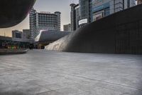 This is an image of a futuristic architecture structure in Seoul, South Korea. The Dongdaemun Design Plaza is featured in the photo, with its modern architecture and unique tile wall surface. Surrounding the plaza are the city landscape and the peaceful river. The image captures the atmosphere of a freezing winter day in Seoul, as snow covers the ground and rooftops. The metal walls and structural elements of the plaza stand out against the snowy backdrop. This photo represents the combination of urban infrastructure and natural beauty in South Korea.