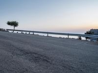 Dawn breaks over Mallorca, Balearic Islands, revealing a scenic coastal landscape. A bike rests against an asphalt road, with a large tree and the majestic ocean in the background.