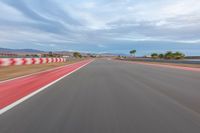 A stunning shot of a straight road stretching into the distance at dawn in the USA. The asphalt glistens under the soft light, creating a captivating scene. The road curves slightly, adding a sense of mystery and adventure. It's the perfect location for racing enthusiasts, with a race track nearby. The sky is adorned with beautiful clouds, making the scene even more picturesque. Get ready to race towards the break of day!