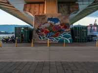 A straight road in the city of Taipei, Taiwan. The wall along the road is covered in vibrant graffiti, adding an artistic touch to the urban landscape. The river flowing nearby reflects the early morning sky, creating a beautiful dawn scene.