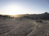 At dawn in Tenerife, Spain, a dirt road winds through a desert landscape. The mountainous terrain and open space create a wilderness feel. Sunlight illuminates the gravel surface, contrasting with the clear sky and the nearby sea.