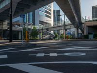 A stunning profile of Tokyo's urban landscape at dawn. The city comes alive as business district lights illuminate modern architecture. Hard shadows and underpasses create a dramatic urban design.