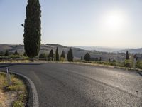 This image captures the beauty of a sunny day in Tuscany, Italy. The rural landscape features a winding road surrounded by lush green grass and tall trees. The asphalt road surface curves gracefully, leading the viewer's gaze towards the horizon. The clear sky allows the sun's rays to bathe the scene in warm sunlight. The picturesque scenery showcases the rugged charm of the Tuscan countryside. This photo embodies the idyllic charm of Tuscany and is a perfect representation of a sunny day in Europe.