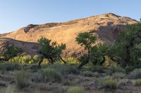 Utah's rugged desert landscape at dawn. Red rock canyons and mountain formations create a stunning backdrop. Open spaces and grassy terrain blend seamlessly with the clear sky. Explore the wilderness on an off-road adventure through this majestic scenery.