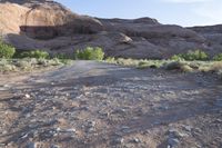 A person stands alone on a trail in the Utah desert, surrounded by red rock formations and rugged mountain landforms. The dawn sky casts a low light on the wilderness. An off-road adventure awaits in North Wash, Utah.