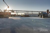 Aerial view of Toronto, Ontario at dawn. The cityscape showcases a mix of architectural styles, from modern buildings to industrial factories. Open spaces contrast with concrete roads and asphalt surfaces. Clear sky reveals the bustling urban transport and construction activities below.