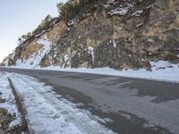 This is an image of a stunning winter landscape in Yunnan, China. At dawn, the clear sky provides a beautiful backdrop for the rugged mountain slope. The foreground features a snow-covered road leading through the icy terrain. The rocks and rock wall showcase the unique geology and formation of the area. The winter setting creates freezing conditions, with snow and ice covering the trees and ground. This photo captures the natural beauty and tranquility of Shangri-La, a hidden gem in Asia.