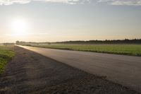 This image captures the serene beauty of a rural landscape in Canada. At dawn, the sun is visible on the horizon, casting a warm and low light on the plain fields and lush vegetation. A deserted road, made of asphalt, stretches into the distance, leading the eye towards a tree-lined lane. The sky above is filled with fluffy clouds and contrails. This picture evokes a sense of peacefulness and tranquility in the countryside of Canada.